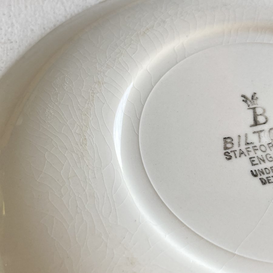 The back stamp says: Biltons, Staffordshire, England. Finewhite Ironstone, Hand Painted. Underglaze Detergent Proof.