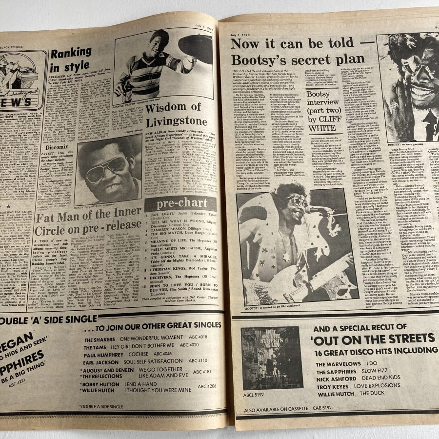 Black Echoes music paper dated 1 July 1978. 20 pages full of features, interviews, news, reviews, charts and adverts for Reggae, Soul, Funk, Disco, Northern Soul etc.