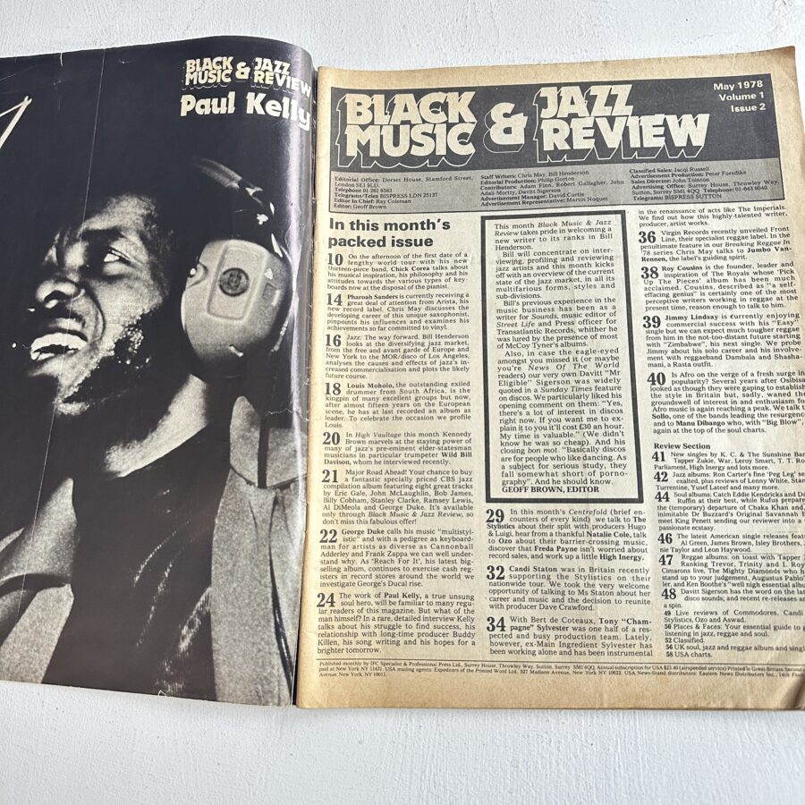 Features/interviews include: Chick Corea, Pharoah Saunders, George Duke, Paul Kelly, Candi Staton, Front Line Reggae, Roy Cousins, Jimmy Lindsay