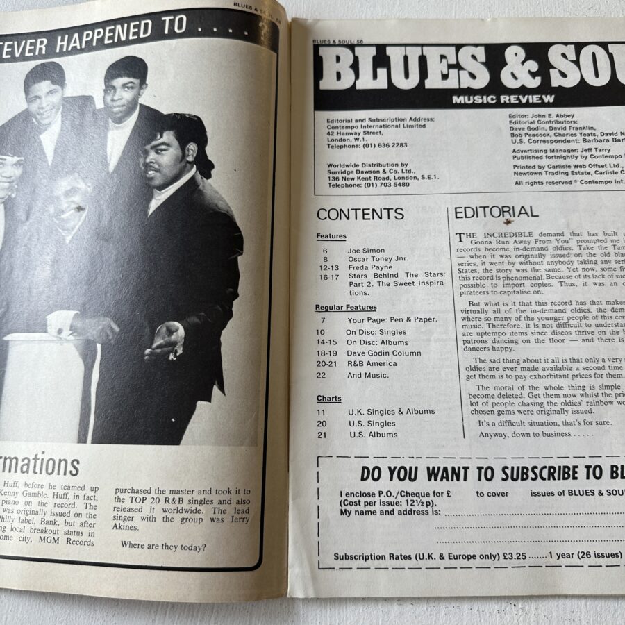 Features and/or interviews include: Joe Simon, Oscar Toney Jr, Freda Payne, Sweet Inspirations, David Godin column etc.