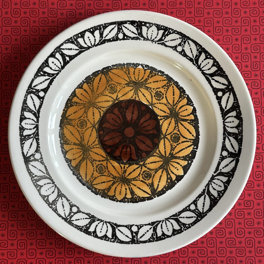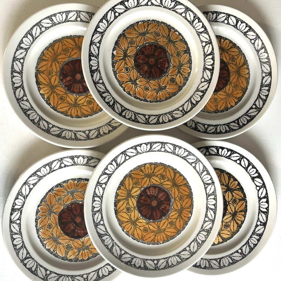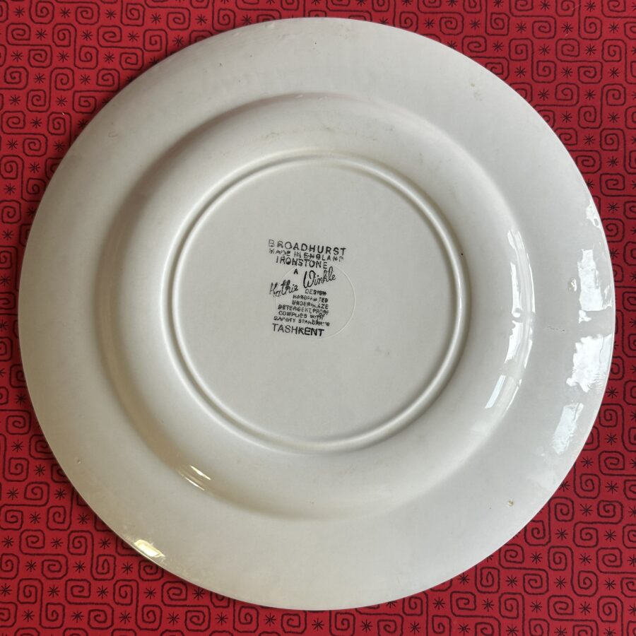 Here is a set of six mid 1970s dinner plates in the Tashkent pattern stamped Kathie Winkle for Broadhurst of Staffordshire.
