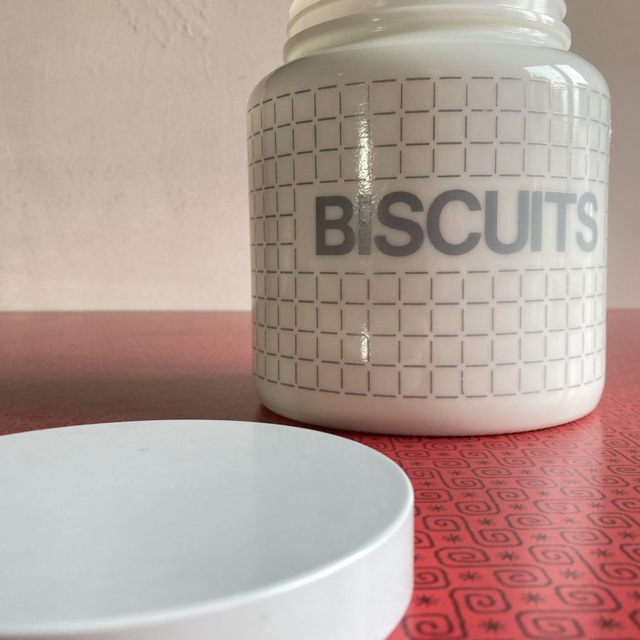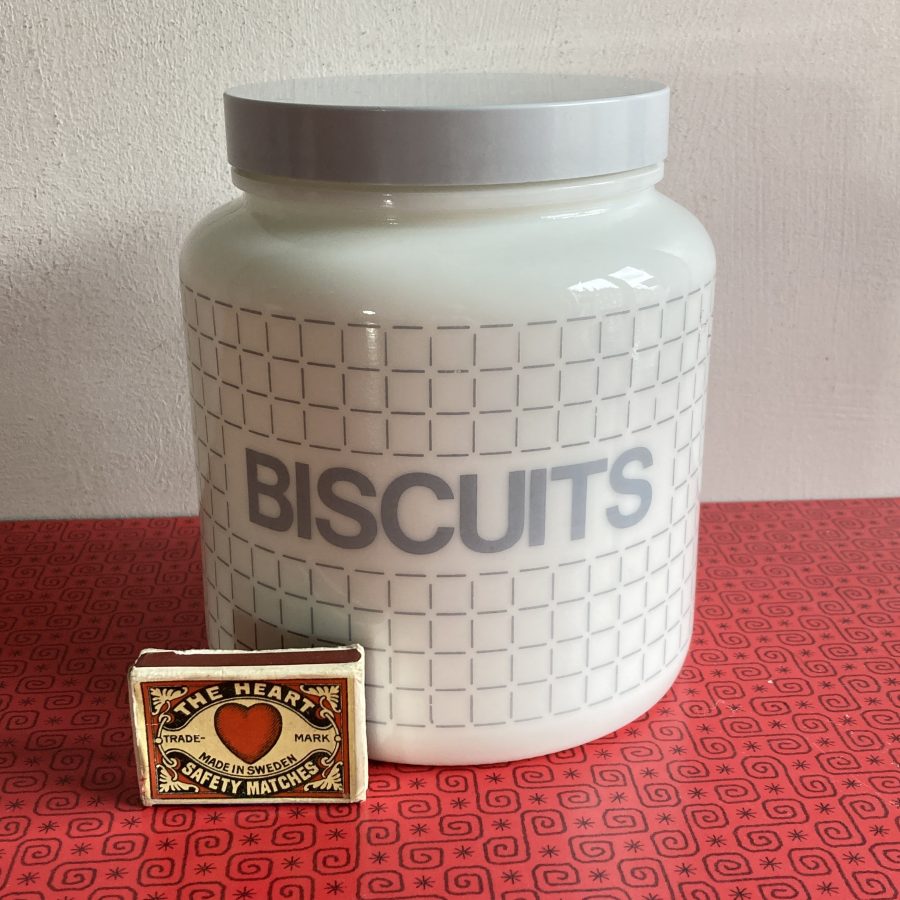 Here is a great looking large size biscuits jar by Candlelight in a white milk glass with a light grey check type pattern and a screw on plastic lid. This is marked on the base Candlelight, Made in England.