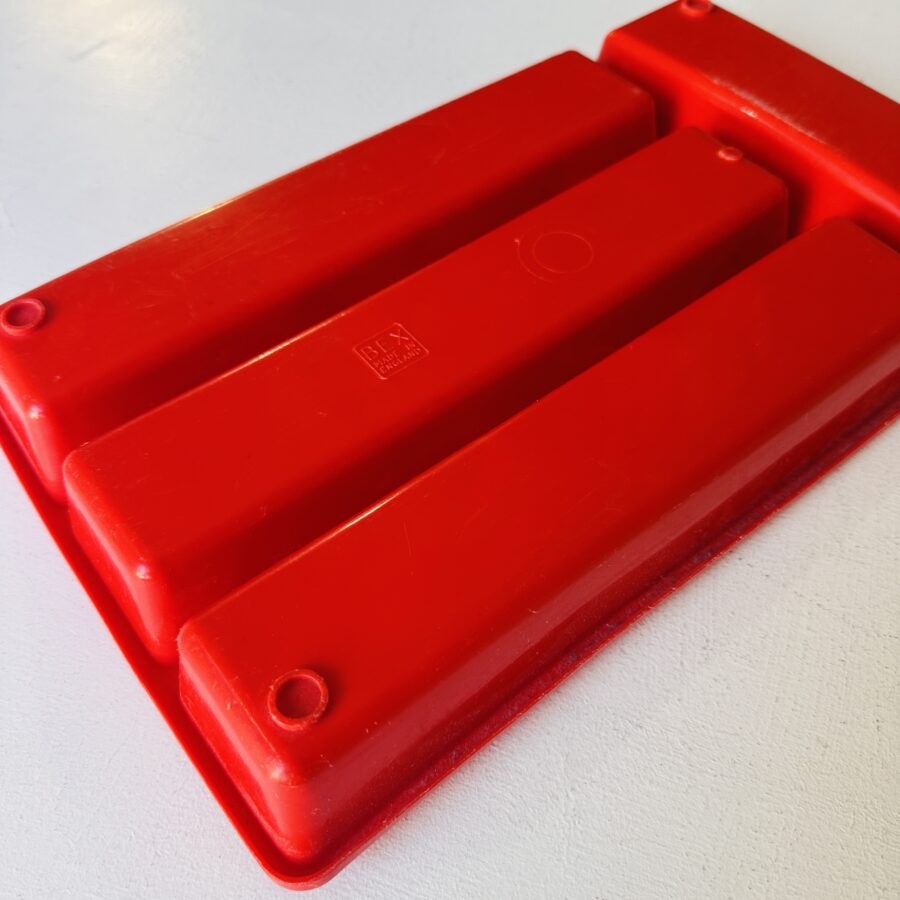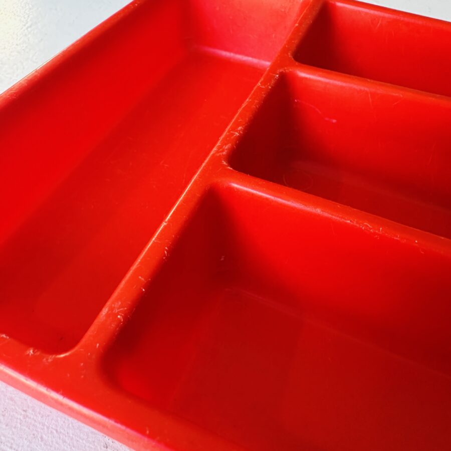 Here is a vintage cutlery storage tray. This is a red soft plastic with four compartments. The base is marked Bex and Made in England.