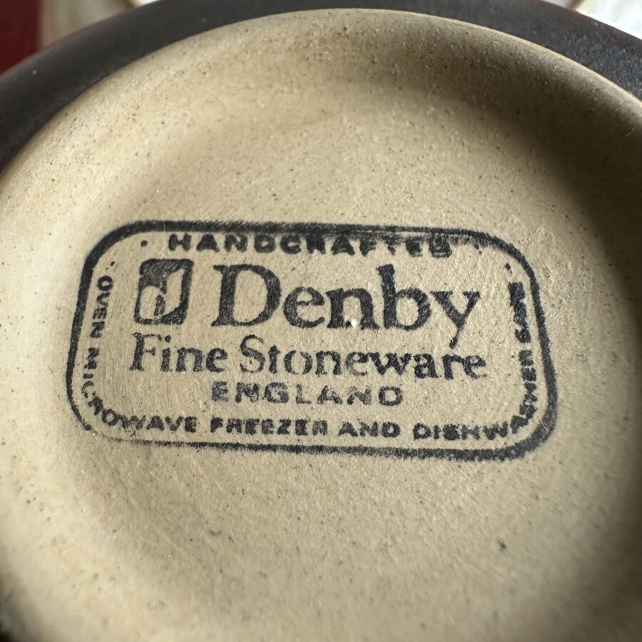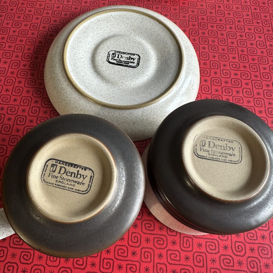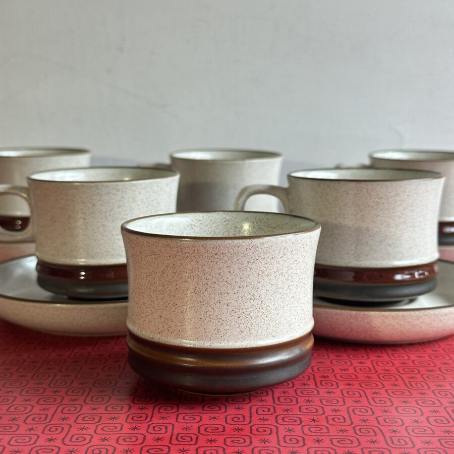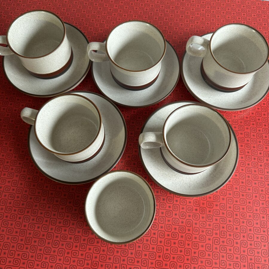 Here is a set of five cups and saucers plus a sugar bowl in the Denby Potters Wheel design.