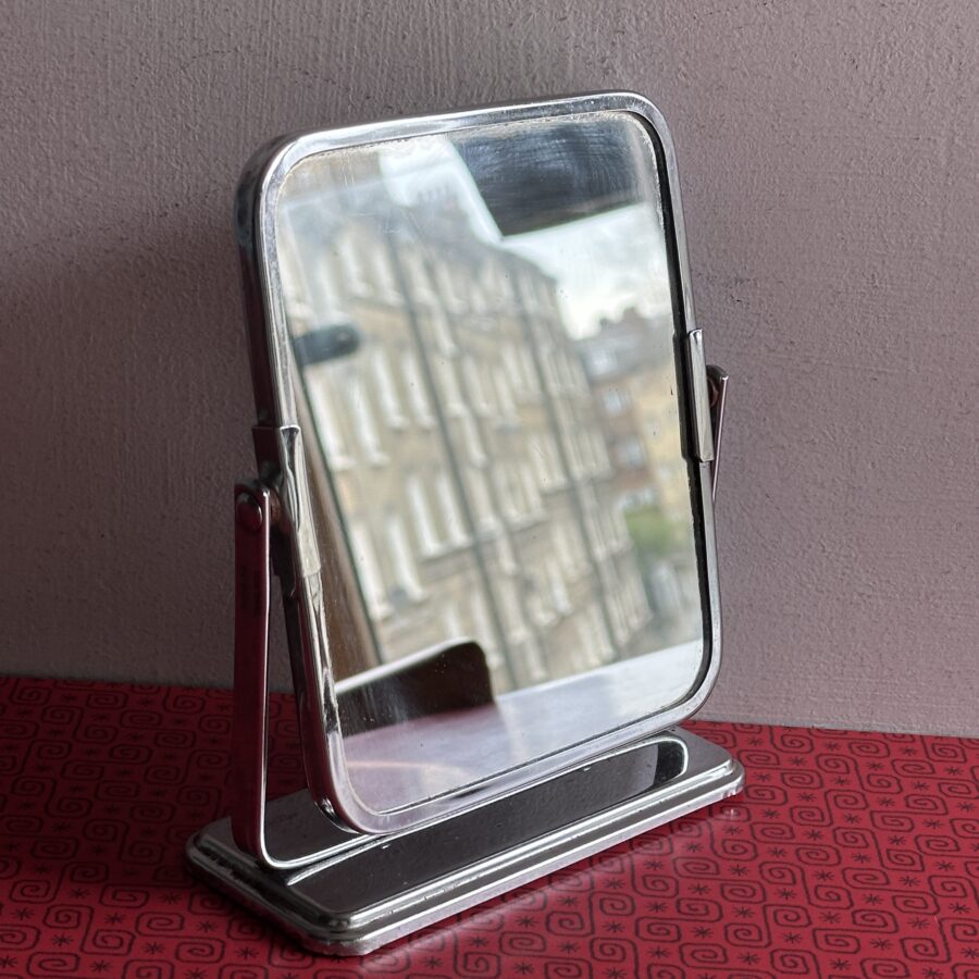 Here is a nice little mirror with a chrome metal stand that is also a wall fixing. This is branded “Meta Mirror” and is marked Made in England. This is probably circa 1960s.