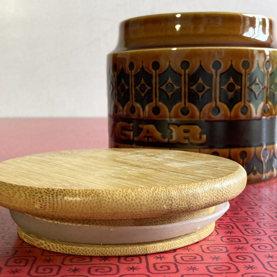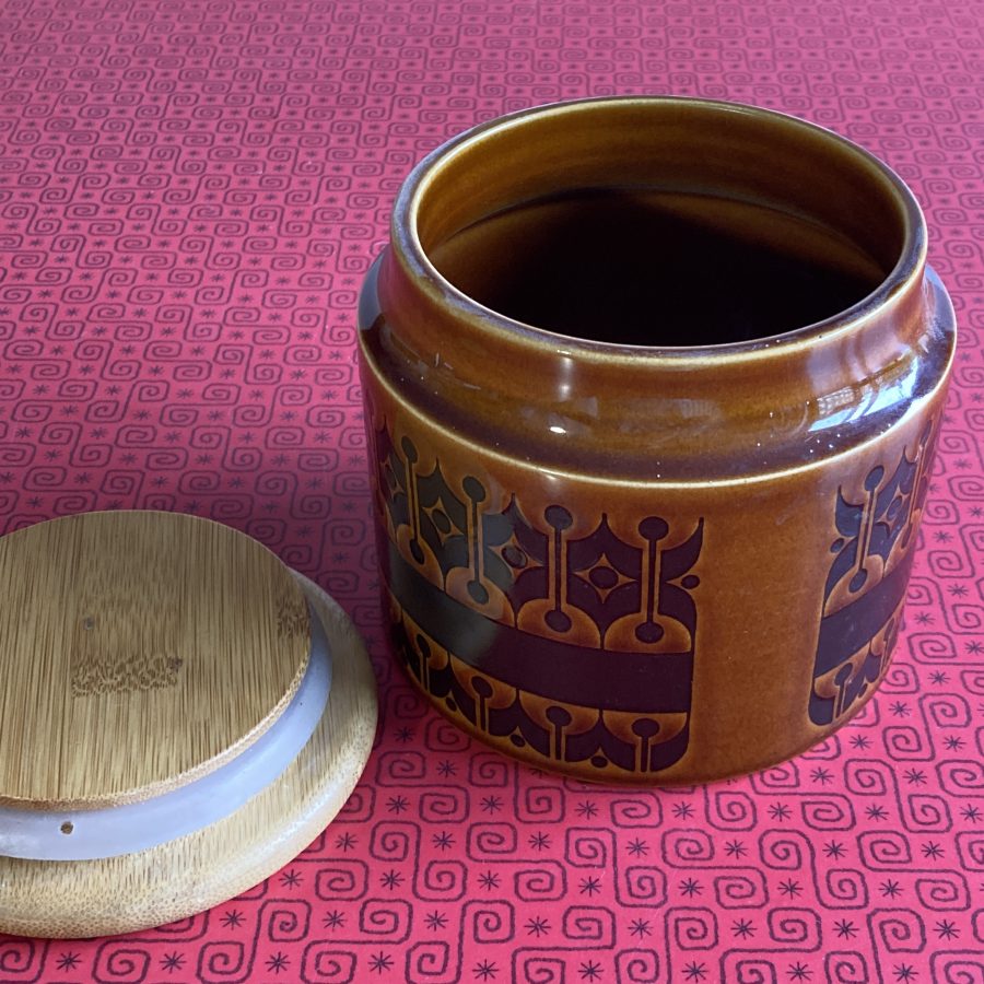 A Hornsea sugar storage jar with wooden lid in the Heirloom pattern. This is stamped Hornsea Heirloom on the base.