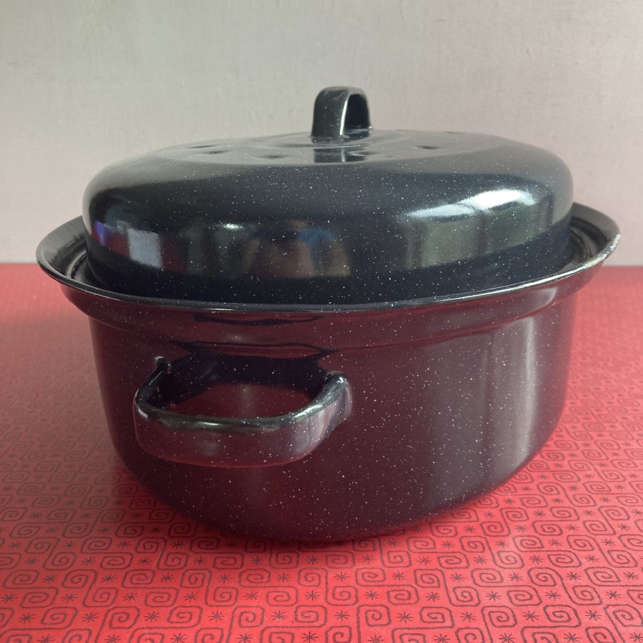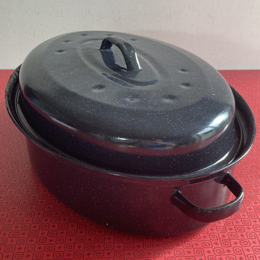 A lovely looking vintage enamel roasting tin complete with lid. This is good and clean and perfect for regular use, it has a sky blue lid and a black base.