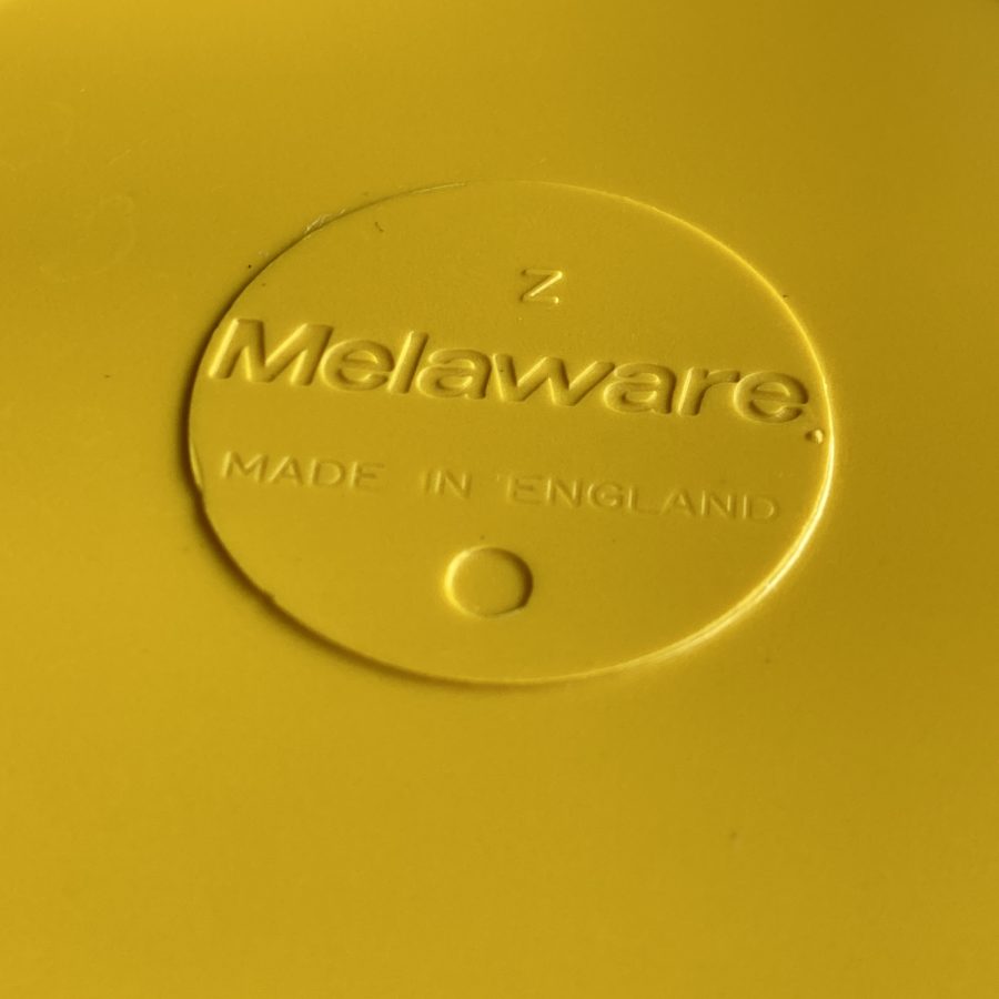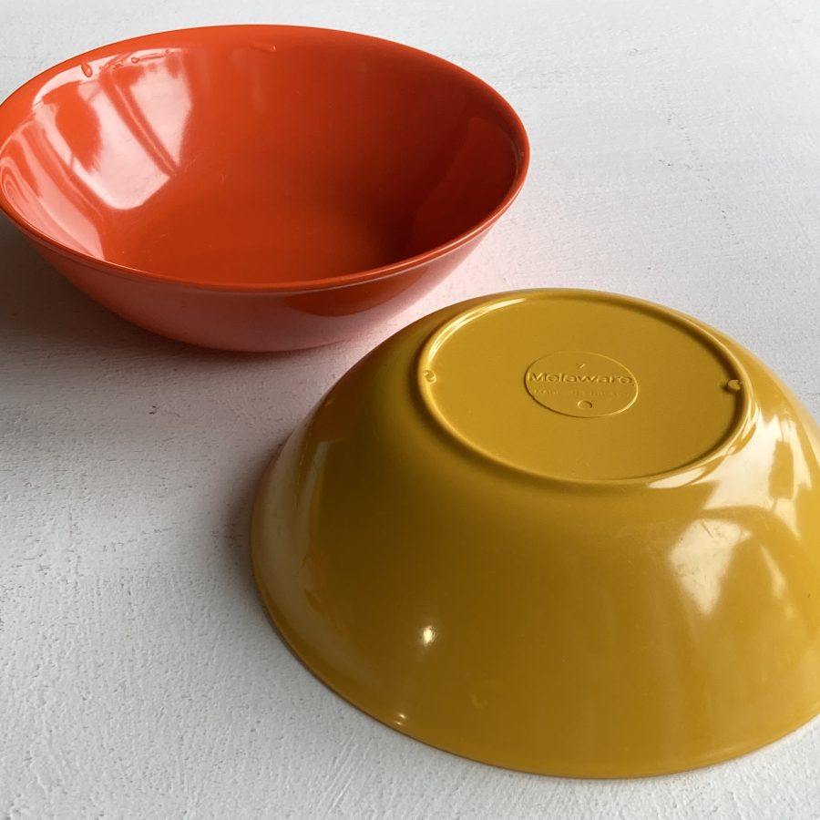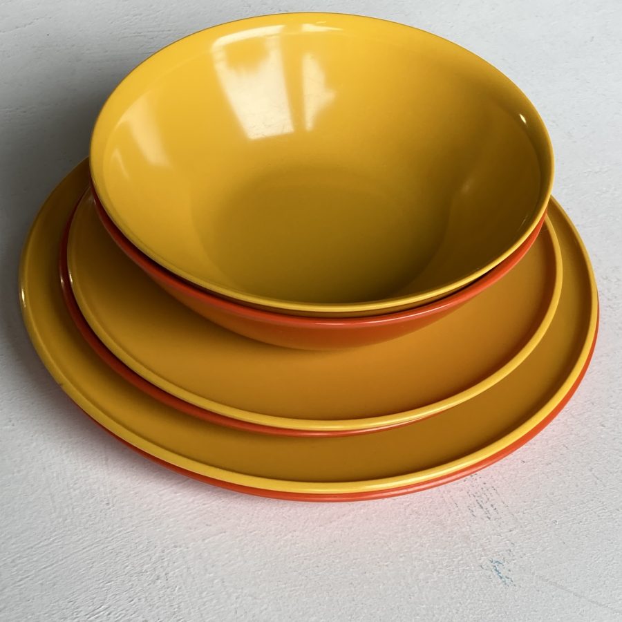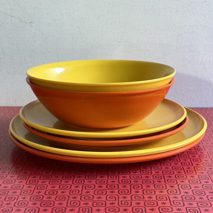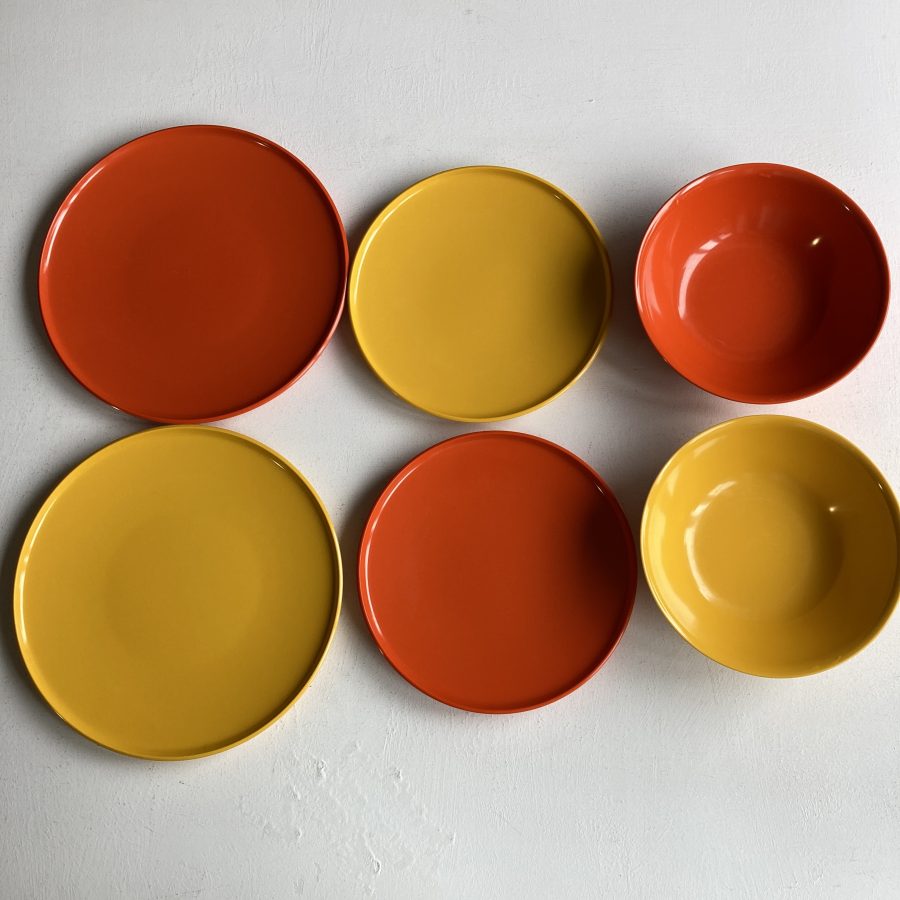 Here is a set of two melamine side plates, sandwich plates and bowls in vivid yellow and orange.