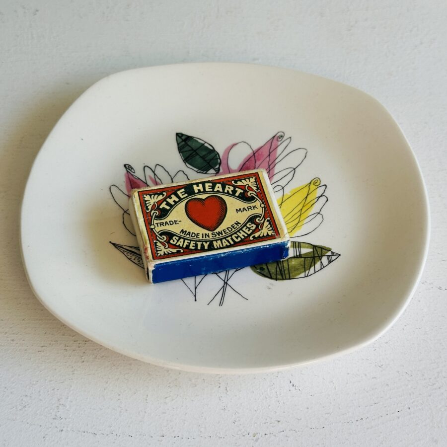 A Midwinter Pottery Stylecraft Fashion Shape side plate in the Melody pattern. The Melody pattern was first issued in 1958 and was designed by Terence Conran, these plates are all dated 5-62 on the base.