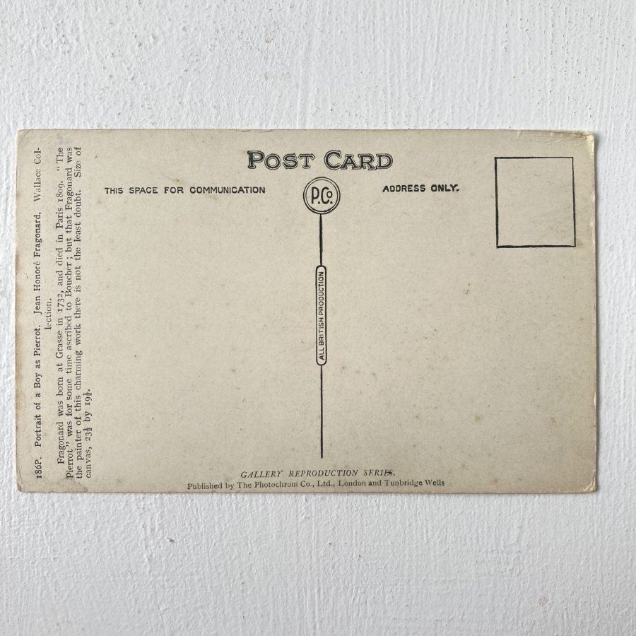 A vintage postcard Portrait Of A Boy As Pierrot by Jean Honore Fraggonard.