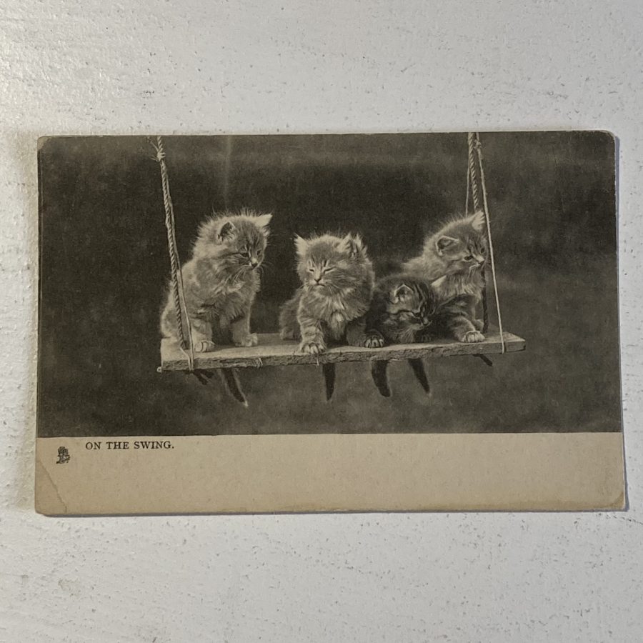 A vintage postcard – On the Swing, featuring 4 cute kittens.