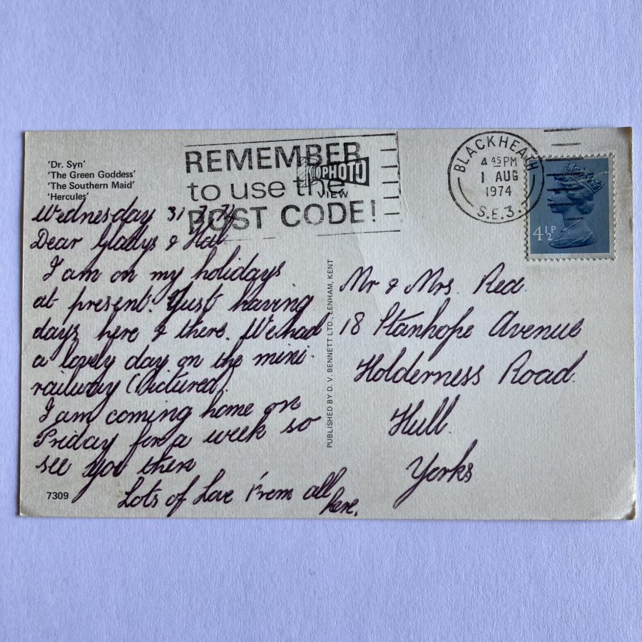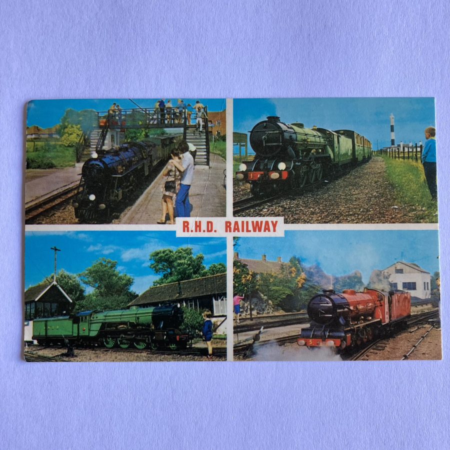 A vintage postcard of Romney Hythe & Dymchurch Railway featuring 4 pictures of small steam trains.