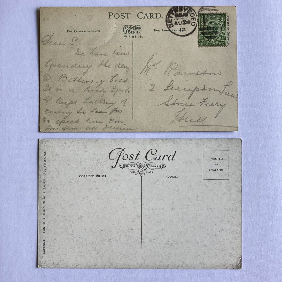 A posted Grosvenor card from 1912 and an unposted Salmon card.