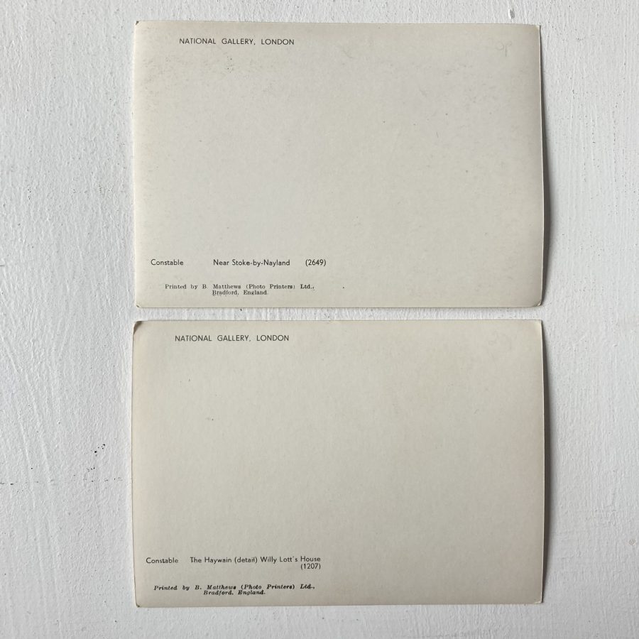 Two vintage National Gallery London postcards of Constable paintings – Near Stoke-by Nayland and The Haywain (detail).