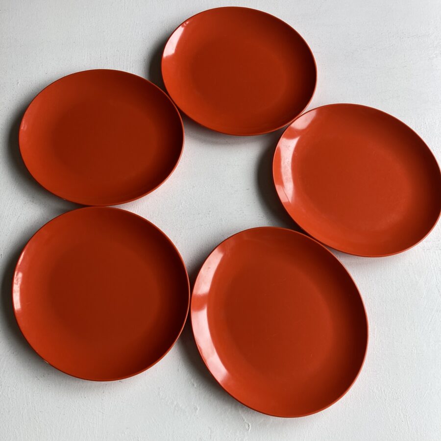 A set of five oval melamine side plates made by Gaydon in their Melmex brand. Circa 1960s. A lovely oval shape and a great vivid orange, these are the very best side plates you’ll find in melamine!