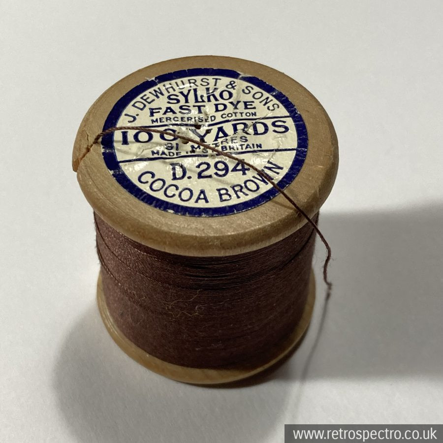 Here is a standard size wooden Dewhurst’s Sylko cotton reel in Cocoa Brown D.294.