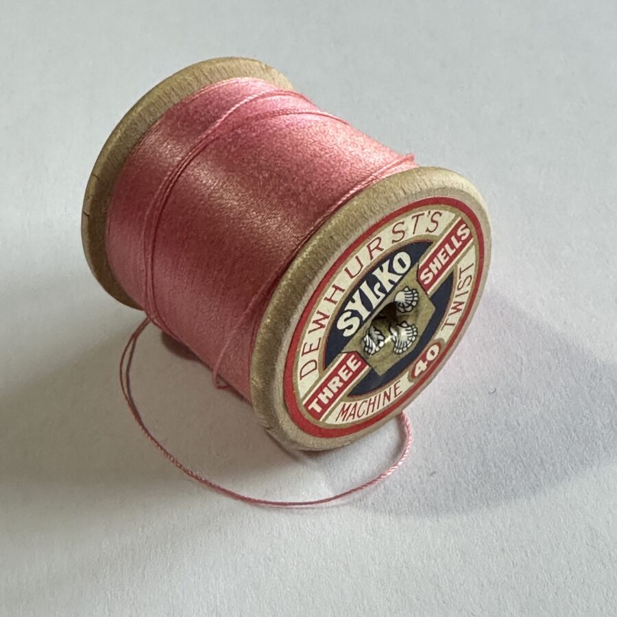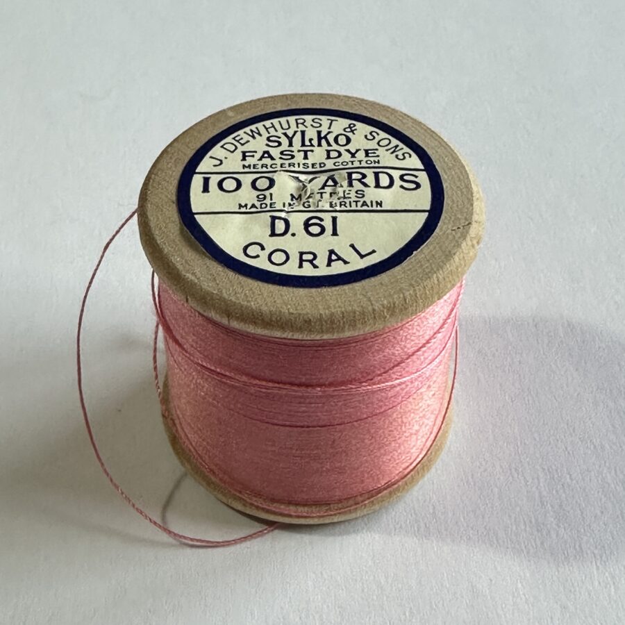 Here is a standard size wooden Dewhurst’s Sylko cotton reel in Coral, number D.61.