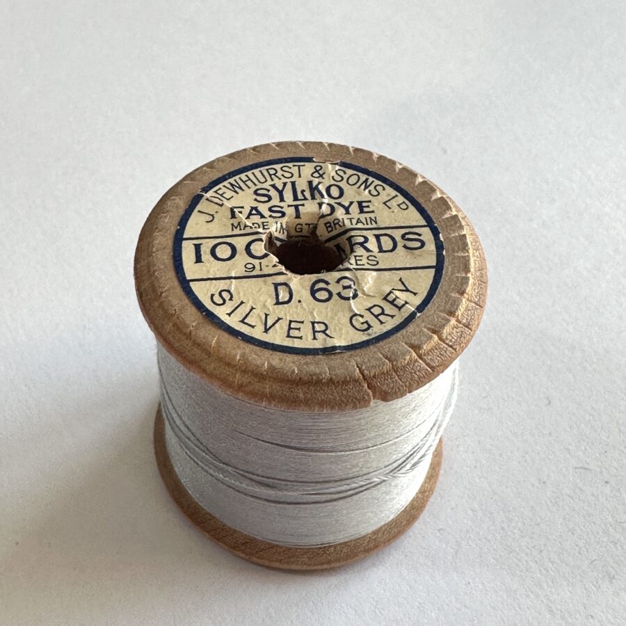 Here is a standard size wooden Dewhurst’s Sylko cotton reel in Silver Grey D.63.