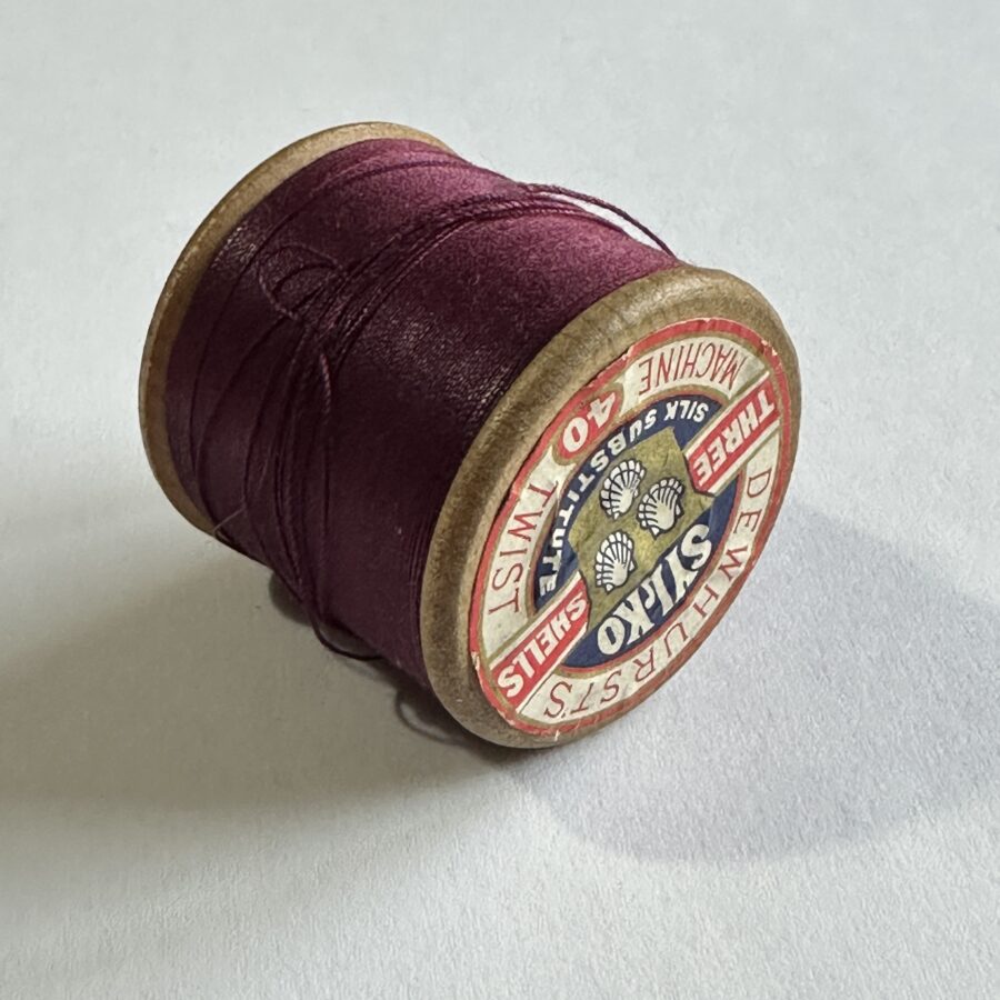 Here is a standard size wooden Dewhurst’s Sylko cotton reel in Wine D.129.