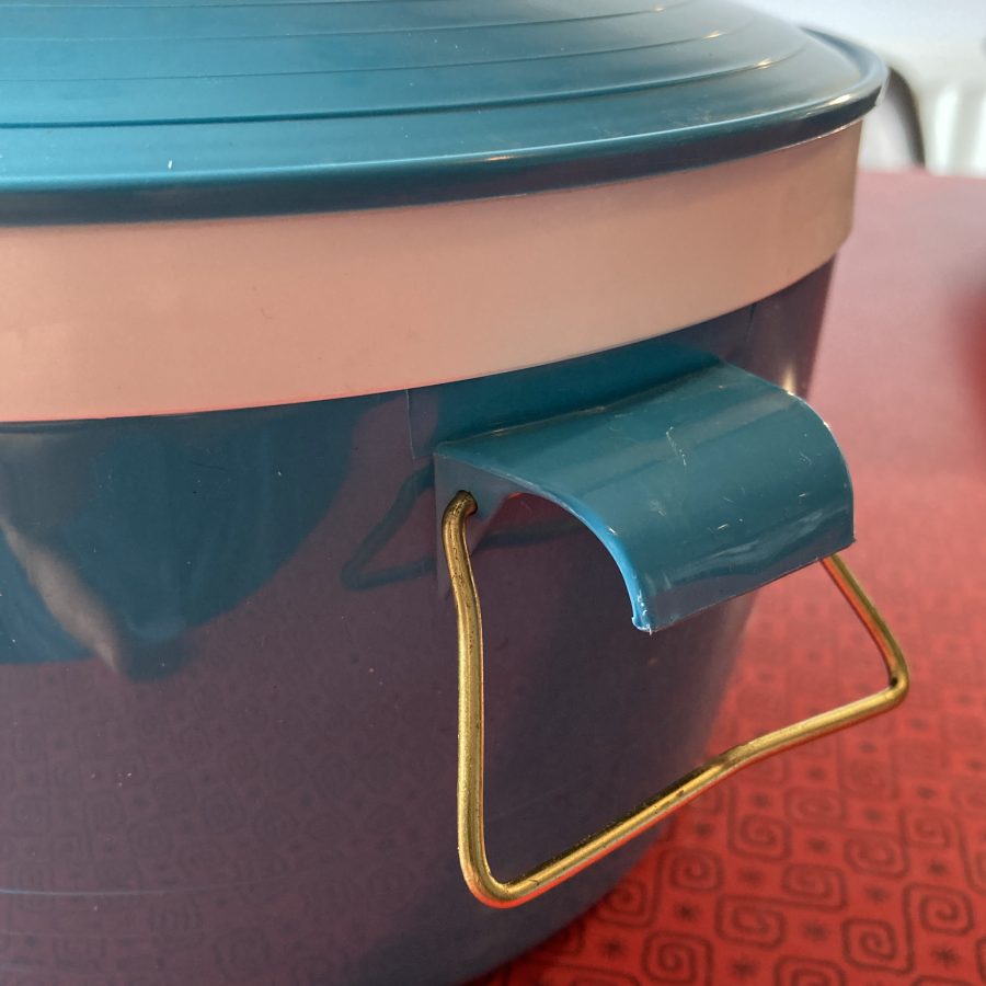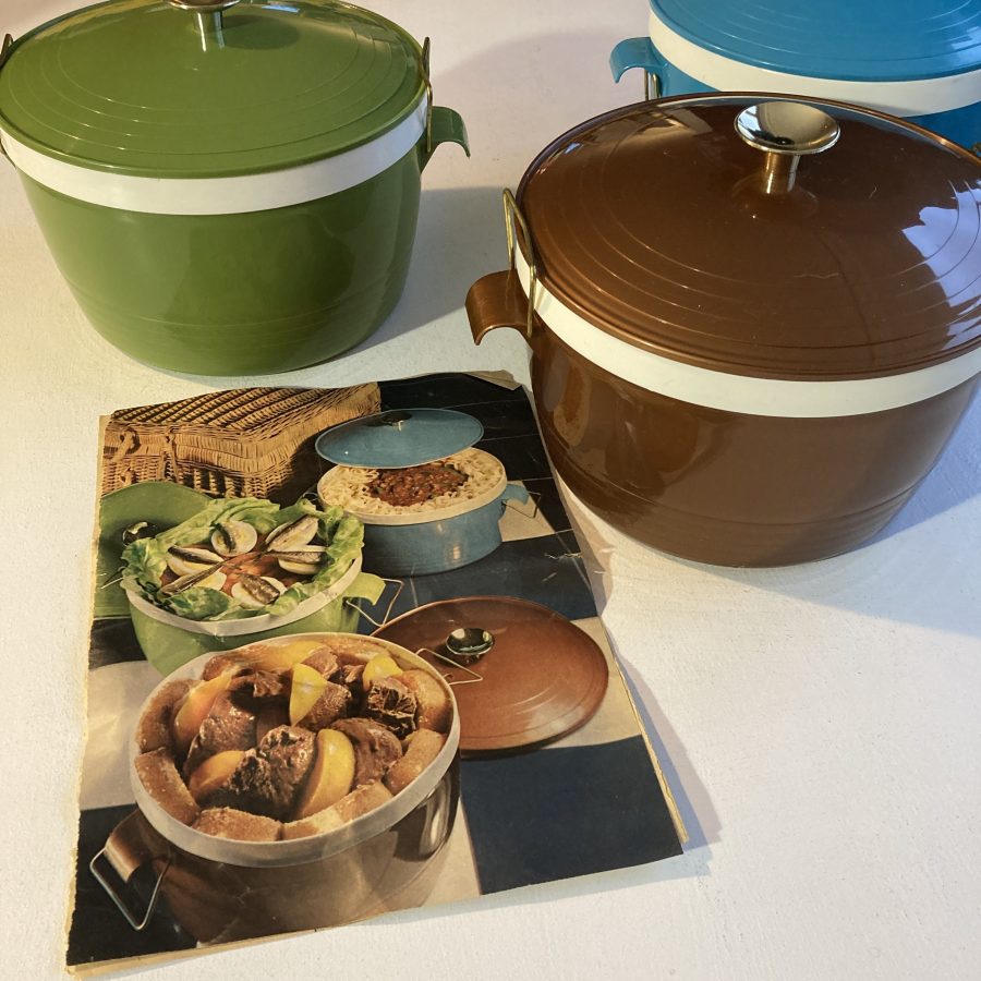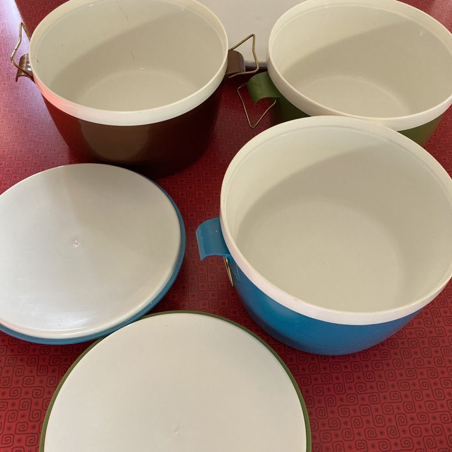Here is a set of three vintage Thermal Welware food storage containers/ice buckets. these are made of a rigid plastic with coloured outers and white interiors with metal clip seals.